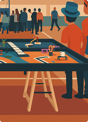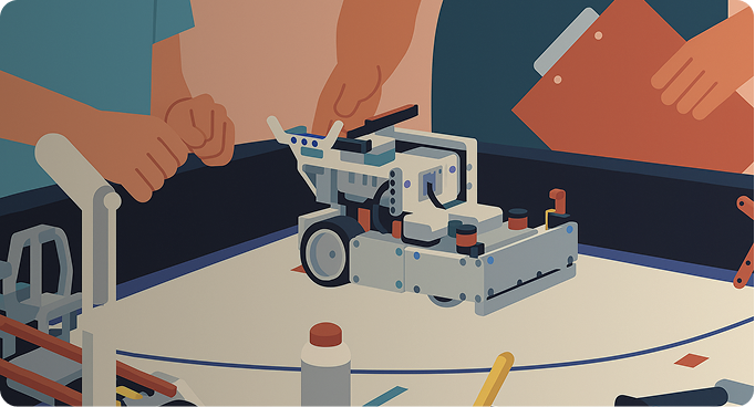 Ilustração com close de uma mesa de competição, com destaque para o robô de LEGO e detalhes das mãos e braços de dois competidores. Vários modelos e peças LEGO estão espalhados pela mesa.